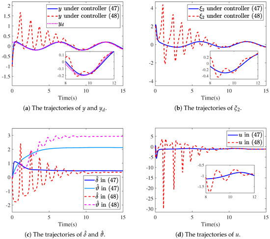 In the simulation, we set unknown parameters ; the design parameters , , , , , ; and the initial values , , . The comparison of simulation results for system (43) under the improved adaptive tracking controller (47) and the classic adaptive tracking controller (48) is offered in Figure 2. Figure 2a presents the system output under controller (47) with a solid line, the system output under controller (48) with a dashed line, and the reference signal with a dotted line. As shown in Figure 2a, it is evident that the system output y under controller (47) tracks the reference signal around 3 s and exhibits relatively few fluctuations with small values, while the system output y under controller (48) tracks the reference signal after 10 s and has frequent fluctuations with large amplitudes. The trajectories of system state , updated laws , , and control input u under controller (47) (see solid line) and controller (48) (see dashed line) are displayed in Figure 2b–d, respectively. One observes from Figure 2b–d that system state, updated laws, and control input under controller (47) also possess a faster response time and smaller fluctuations compared with those under controller (48). Therefore, according to the above comparison, we can conclude that the adaptive PTC approach in Theorem 1 of this paper is superior to [16] in terms of response time and fluctuation degree. Moreover, the control effort required to make the closed-loop system bounded in this paper is also significantly less than that in [16].