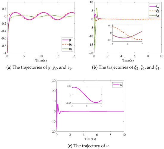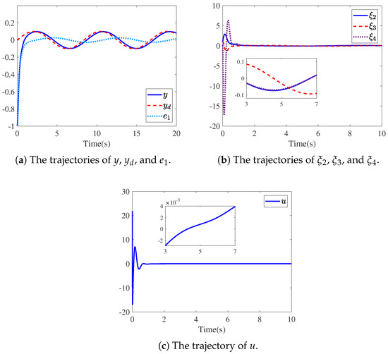 In the simulation, taking the design parameters , , , , and the initial values , , , Figure 3 gives the responses of the closed-loop system (4) and (54) with . The response curves of the system output , the reference signal , and the tracking error are offered in Figure 3a. From Figure 3a, one clearly sees that the system output y (see solid line) is able to track the desired signal (see dashed line) about 2 s later. Meanwhile, the tracking error (see dotted line) is convergent to a bounded region around 2 s. Figure 3b provides the response curves of system states , , and , while Figure 3c depicts the trajectory of control input u. It can be observed from Figure 3b,c that , , , and u are also bounded 2s later. The simulation results in Figure 3 reveal the validity of the control method proposed in Corollary 1.