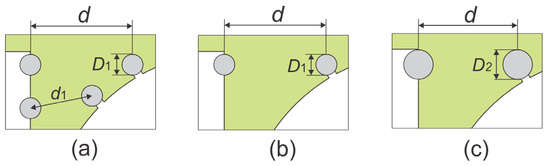 Geometry of the stator shaded pole with the position, number and diameter of the auxiliary shaded coils: (a) two coils (reference model), (b) one coil (the same position and dimension as in the reference model, D1 = 2.4 mm and (c) one coil with the larger diameter, D2 = 3.4 mm. The center-to-center distance between the cross-sections in all models was d = 11.5 mm. The distance d1 in Figure 1a was d1 = 7.7 mm.
