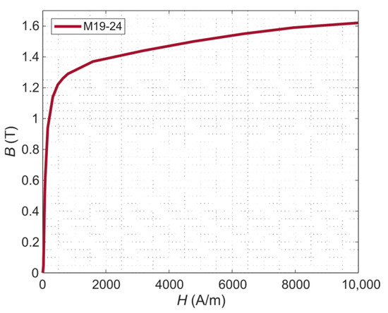 The material properties assigned to both the stator and rotor ferromagnetic region were taken from the Ansys Maxwell library (i.e., M19-24 [22,23]). The B(H) curve of the material M19-24 is shown in Figure 3.