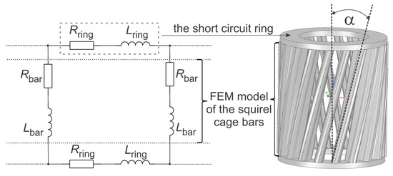The shape of the 2D numerically modeled squirrel cage rotor bars, which were modeled as solid aluminum conductors, is shown in Figure 1a. Since the motor was modeled in 2D, the rotor bars in all our models were connected together via an external equivalent circuit composed of the resistance and inductance of the short-circuit squirrel cage ring. The equivalent circuit of the rotor squirrel cage coupled with the 2D finite element model of the motor is shown in Figure 4, where Rbar and Lbar stand for the resistance and inductance of the rotor bars (i.e., active part of the squirrel cage), while Rring and Lring stand for a segment of the short circuit ring connecting the adjacent bars (Figure 4). It should be noted that the auxiliary coils located at the shaded stator poles were also modeled as massive copper conductors and connected together according to the described procedure. The values of the elements Rbar and Lbar are automatically calculated with the Ansys Maxwell built-in routine based on the geometrical and material properties of the bar/coil geometry segments, while the elements Rring and Lring need to be additionally defined by the user. These values can be analytically calculated by taking into account the geometrical and material properties of the short circuit ring [2]. The assigned values to the short circuit ring of the squirrel cage were 5 × 10−6 Ω and 10−8 H, while the assigned values to the short circuit ring of the shaded coils were 10−9 Ω and 10−9 H.