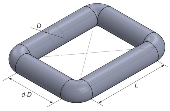 It should be noted that in the case of the shaded-coil motors with shorter axial length L (which is the case in this study), the end region volume of the shaded coil presents almost half of the total volume of the coil; therefore, it cannot be easily omitted while calculating the mcu. We therefore also calculated and compared the total mass of the shaded coil (by considering the complete geometry shown in Figure 5) for all three models. The total mass of the shaded coils is calculated according to Equations (7)–(9), which we derived for the reference model with two coils (Figure 2a), the model with one coil with D1 (Figure 2b) and the model with D2 (Figure 2c), respectively.