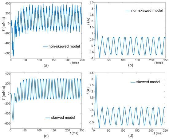 The results of the numerical simulations performed with the 2D numerical model of the reference motor design (Figure 1) with the non-skewed α = 0° and skewed rotor α = 27° are given in Figure 6. The instantaneous electromagnetic torque profile and the main winding current time profiles calculated with the model with the non-skewed rotor are shown in Figure 6a,b, respectively. The torque and current signals obtained from the model with the skewed rotor are shown in Figure 6c,d.