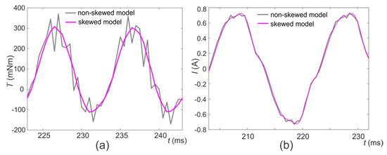 The results in Figure 6 demonstrate and confirm that the ripple present in the electromagnetic torque signal can be efficiently reduced due to the rotor skewing. For a clearer representation of the torque ripple reduction obtained in the model with the skewed rotor α = 27°, with respect to the non-skewed rotor, we visualized and compared the instantaneous torque signals along the last two periods of time (during the equilibrium of the signal after the transient)—Figure 7a. The comparison demonstrates that the torque ripple present in the instantaneous electromagnetic torque can be significantly reduced with the appropriate rotor skewing. The comparison of the main winding current profiles (Figure 7b) obtained in the two models (α = 0° vs. α = 27°) also demonstrates that the noise present in the current signal due to the nonlinearities and magnetic saturation can be mitigated with α = 27°.