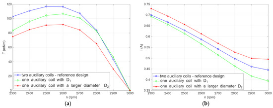 Comparison of numerically calculated (a) static torque characteristics and (b) rms values of the main winding currents vs. rotational speed for all three models with the shaded-pole configuration, number and size of auxiliary coils depicted in Figure 2.