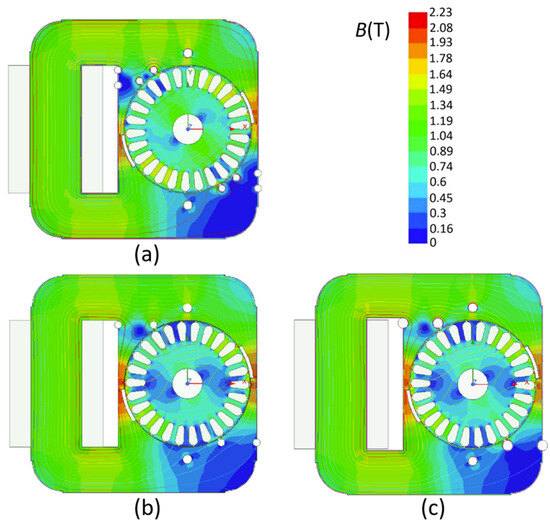 The calculated magnetic flux density distribution B(T) in the shaded-pole model at n = 2800 rpm: (a) reference model geometry with two auxiliary coils, (b) reference model geometry with one auxiliary coil and (c) model with one auxiliary coil with the larger diameter D2.