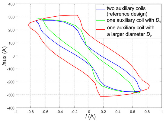 Based on the calculated currents in the main and auxiliary windings, we can plot a hodograph (Figure 10), which represents the relationship of currents I(Iaux). Figure 10 depicts the resulting hodograph I(Iaux) calculated at the nominal working point (i.e., n = 2800 rpm) during the last period of the observed current signals. A similar relationship of I(Iaux) can be observed at other working points, with the highest value of the currents expected under the starting condition (i.e., n = 0 rpm). The hodographs at n = 0 rpm should also contain the transient dynamics of the starting/inrush currents. In order to precisely demonstrate and compute the transients, the mechanical transient behavior (by taking into account damping and moment of inertia) should also be considered and the 3D numerical models used to precisely address the local inhomogeneity and saturations, which reflect in the transients of the starting/inrush current. The hodographs indirectly illustrate the rotating field profile that is created in the air gap between the rotor and stator with a specific motor design (i.e., number and diameter of the shaded coils) [2].