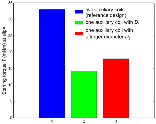 We further investigated the influence of the number and size of the shaded coils on the starting torque at 0 rpm. The calculated starting torques Tstart are shown in Figure 11. The results show that the model with two shaded coils develops a higher starting torque Tstart = 33 mNm due to the presence of a stronger rotating field compared to the model with the same design but one shaded coil (i.e., Tstart = 14.3 mNm), as also demonstrated via the corresponding hodographs given in Figure 10. Based on this, we can conclude that if a large starting torque is not required (e.g., in many home appliances), a motor with a single shaded coil could be used without reducing the torque at the nominal operating point. However, if the starting torque is necessary, two shaded coils per stator pole can provide two times higher value of the starting torque compared to the single coil design. The starting torque can be increased, with the shaded coil having a larger diameter, due to the higher winding current and thus stronger/wider rotating field, as also demonstrated with the corresponding hodograph (Figure 10). Namely, the starting torque obtained with the design with D2 was Tstart = 18.2 mNm. However, our results demonstrate that such a design does not contribute to better performance at the nominal operating point of the motor (Figure 8 and Table 1).