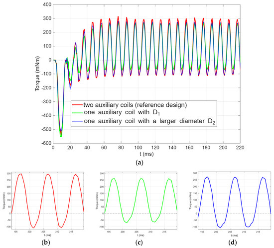 (a) Comparison of the calculated instantaneous torque profiles for all three analyzed numerical models. (The short duration breaking torque corresponds to the area below the dashed line). (b–d) The torque signal obtained with the numerical model of the reference motor design with two auxiliary coils (reference motor design), one auxiliary shaded coil with diameter D1 and one auxiliary shaded coil with a larger diameter D2, respectively.