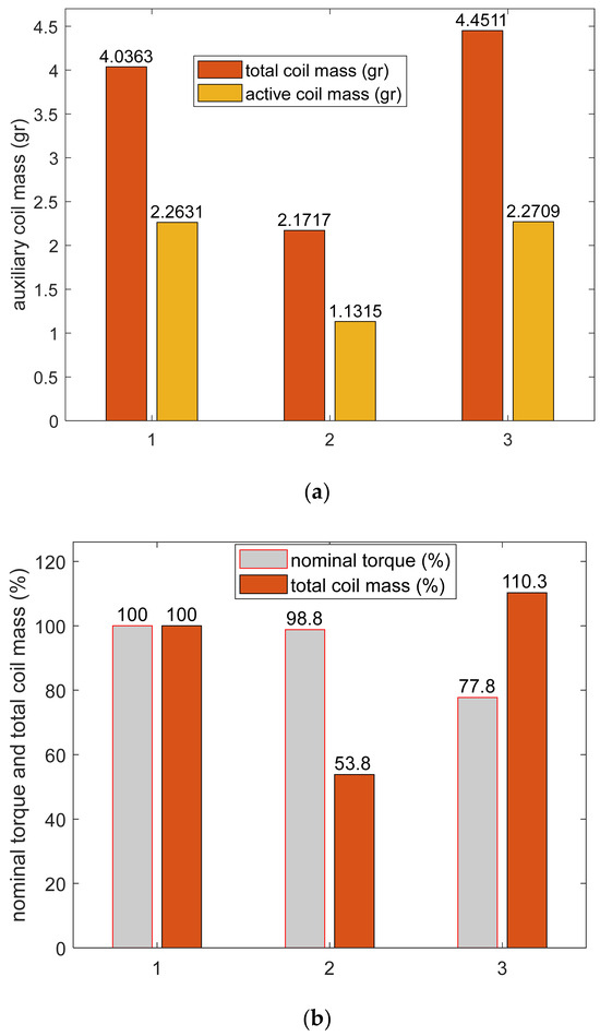 (a) Comparison of active versus total amount of copper needed for the shaded-coil design in all three models indicated with numbers 1, 2 and 3 (1—reference model; 2—model with one shaded coil and R1 and 3—model with one shaded coil with R2) and (b) comparison of the calculated nominal torque and the corresponding amount of copper needed for the design of the auxiliary winding coils/shaded coils in all three models. Both the nominal torque and the coil mass are normalized to the values calculated with the reference model (i.e., the model with two shaded coils—Figure 2a).