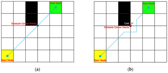 where w is the penalty weight for passing through obstacle boundaries and p1 is the number of times the path crosses obstacle boundaries. The penalty weight is set by multiplying the sum of the horizontal and vertical grid numbers by the weight coefficient, w1, in Equation (2) to represent the maximum possible distance in the given map. The extended cost function applying the OC weight factor to the Conventional A* algorithm is shown in Equation (4).