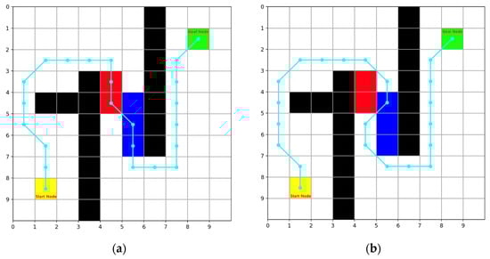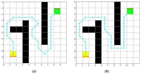 Figure 2 shows the effect of the PD weight factor in a 10 × 10 grid map. Figure 2a shows the case where the OC weighted A* algorithm was applied, containing unnecessary detour paths, while Figure 2b shows that the OC-PD weighted A* algorithm generates a more efficient path.