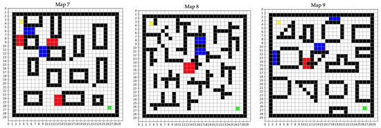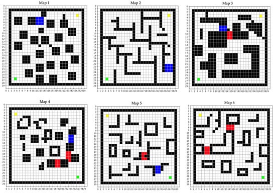 Nine virtual 2D maps with different characteristics were designed to comprehensively analyze the impact of each weight factor of the WIA* algorithm on path generation. As shown in Figure 4, all the maps consisted of 26 × 26 grids, with differentiated driving suitability settings for each grid node. The value of driving environment suitability was defined as 0, 15, and 95 for the white, blue, and red nodes, respectively. The white nodes represent areas highly favorable for driving, such as flat terrain. The blue nodes indicate moderately favorable areas with minor obstacles or slight slopes. The red nodes correspond to areas highly unfavorable for driving, such as stairs, steep slopes, or hazardous terrain, that should be avoided whenever possible.