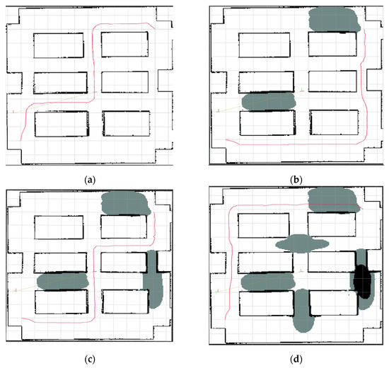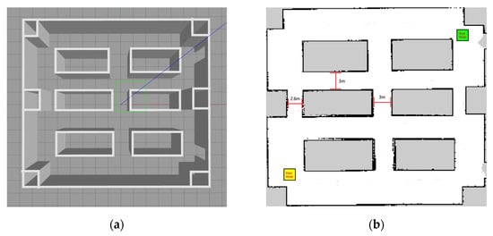 A 3D virtual environment was constructed using the Gazebo simulator to simulate actual mobile robot operating environments. The 3D virtual environment is shown in Figure 5. The experimental environment modeled Room 501 of Hanuri Hall at Sangmyung University. In Figure 5a, the experimental environment has a size of 40 m × 40 m and has six static obstacles of 12 m × 6 m each. The grid resolution was set to 800 × 800 to implement a 5 cm resolution, and Turtlebot3, with a width of 30 cm and a length of 22 cm, was used as the mobile robot. The virtual sensors used in the experiment consisted of 2D LiDAR, IMU, and wheel encoders.