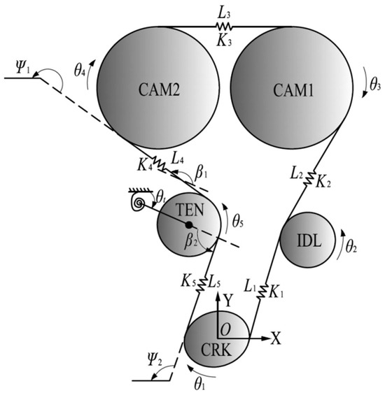 As shown in Figure 1, the timing belt drive system uses excitation from the crankshaft pulley in a clockwise direction with a periodic rotational vibration. The system consists of a crankshaft (CRK) elliptical pulley, an idler (IDL) on the tight side, two camshafts pulleys (CAM1 and CAM2), and a tensioner (TEN) on the slack side. The coordinate O-XY is established with an origin point in the center of the crankshaft pulley, and all the pulleys are described according to the coordinate. and are the length and the stiffness of the ith belt span, respectively. and denote the angular displacements of the ith pulley and the tensioning arm, respectively. and are the angles from the fourth and fifth belt spans to the negative X-axis in the anticlockwise direction, respectively.