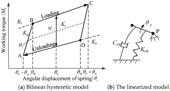 In Figure 2a, and represent the spring stiffness and the lag stiffness, respectively. and represent the loading stiffness and the unloading stiffness, respectively. and are the lag angle and rotational amplitude of the tensioning arm in the hysteretic stage, respectively. and are the equivalent damping and the equivalent linear stiffness of tensioner. is the friction torque during the loading and unloading process.