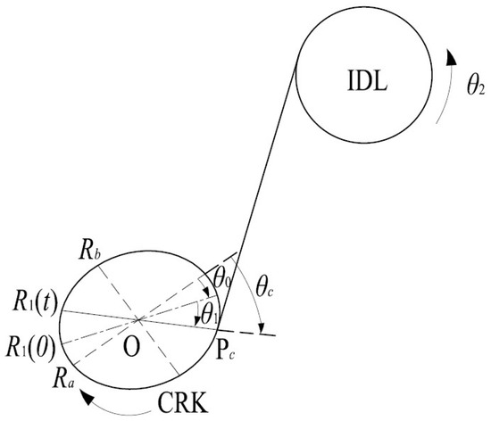 In Figure 3, the major axis radius and minor axis radius of the elliptical crankshaft pulley (CRK) are denoted as and , respectively. If the crankshaft pulley rotates through an angle at time t, the radius at the tight side changes from (0) to (t). represents the tangent point on the tight-side belt span at time t, and and denote the angles between the radial axis at the tangent point and the major axis at the initial moment and time t, respectively.