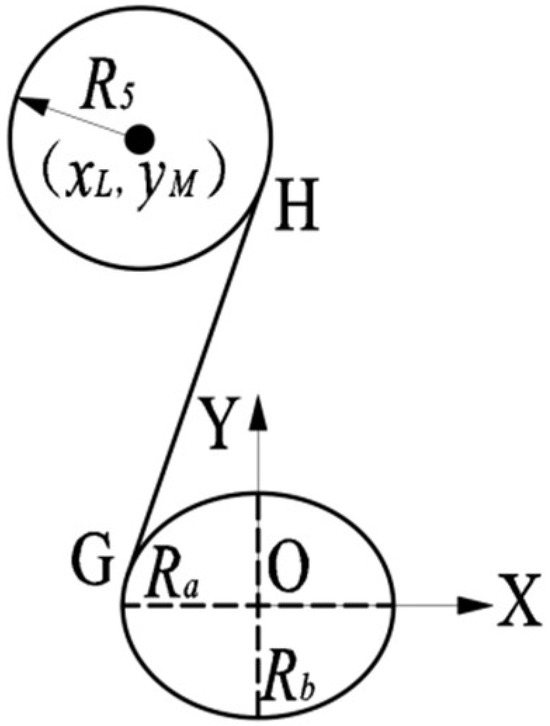 where the initial values of tangent point G (, ) and tangent point H (, ) are the coordinates of the left endpoint of the elliptical pulley and the right endpoint of the circular pulley, respectively. The slope and intercept of the common tangent are determined according to the two tangent points.
