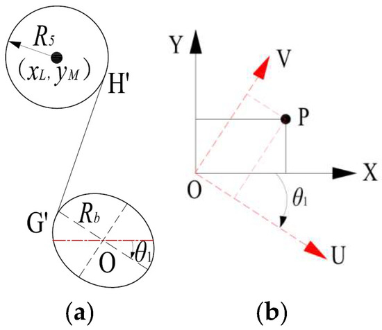 When the elliptical pulley rotates clockwise, the center coordinates (, ) are converted from the coordinate system XOY to the coordinate system UOV. In the new coordinate system UOV, the initial positions of the elliptical pulley and the circular pulley are transformed into a specific form, and then the slope of the tangent span GH under the coordinate system UOV is obtained by solving Equation (19). Thus the inclination angle between the tangent GH and the negative direction of the X-axis is