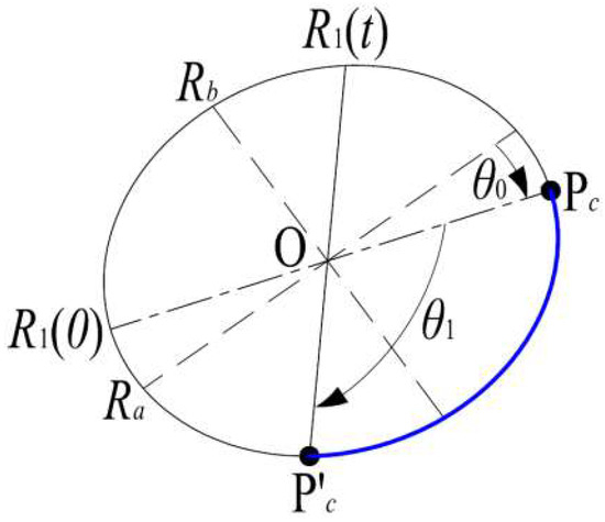 Figure 7 shows the position of the elliptical pulley after a clockwise angle . Its tangent point changes from to . It can be seen that the rotation arc length of the elliptical pulley in the integral term is . The radius corresponding to the tangent point and the tangent point are and , respectively. The relative angles between the two tangent points and the long axis of the elliptical pulley are and , respectively.