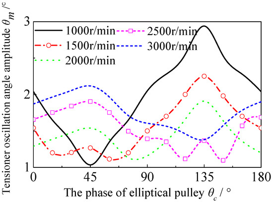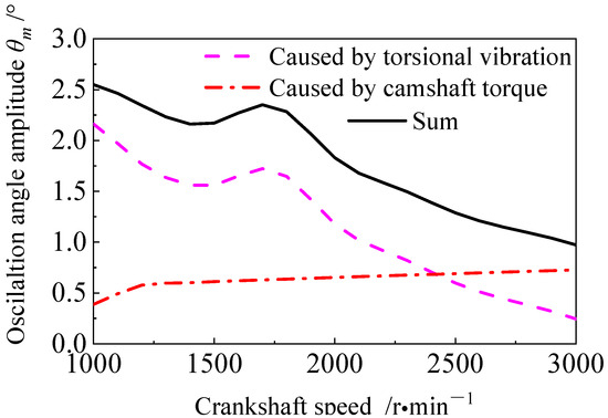 The oscillation amplitude of the tensioning arm can comprehensively reflect the dynamic performance of the system, such as the belt tension variation, the transmission error between the driving pulley, and the driven pulley. The smaller the oscillation amplitude , the smaller the variation in the working torque of the tensioner, the smaller the belt tension variation, and the more accurate the transmission. According to the crankshaft rotational vibration excitation and camshaft load, as given in Figure A1 and Figure A2 of Appendix A, the generation source of the oscillation angle amplitude of the tensioning arm at each speed with a regular circular crankshaft pulley are analyzed, as shown in Figure 8.