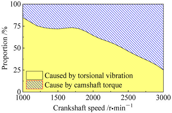 In Figure 8, the oscillation angle of the tensioning arm is mainly caused by the low-excitation speed crankshaft rotational vibration. With the increase in rotational speed, the amplitude of the oscillation angle of the tensioning arm caused by rotational vibration gradually decreases. This is because the rotational vibration of the crankshaft decreases at a higher speed. The amplitude of the oscillation angle of the tensioning arm caused by the camshaft load increases slightly with the rotation speed. The reason for this is that the camshaft load changes very little with the rotation speed. At the same time, the damping value of the tensioner decreases at a higher speed.