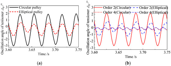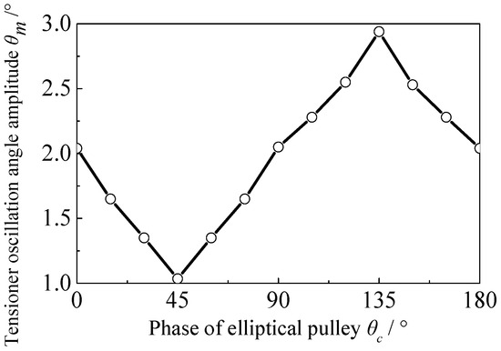 According to the method stated in Section 2, the system’s performance with an elliptical crankshaft pulley will be analyzed in this section. The parameters of the tensioner, system, and belt are shown in Table A1, Table A2, Table A3 and Table A4 of the Appendix A. The rotational vibration of the crankshaft is obtained and shown in Figure A1 of Appendix A. The rotational vibration of the crankshaft is mainly of the second order. The load of camshafts is periodic, as shown in Figure A2 of Appendix A.