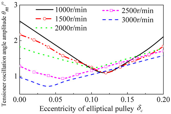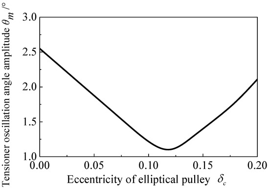 The conclusions are drawn as follows: (1) If the initial phase angle of the elliptical pulley aligns with the phase of order excitation, it generates opposing rotational speed fluctuation excitations that counteract the second-order crankshaft excitation components. (2) With a larger eccentricity of the elliptical pulley, the dynamic performance is first better and then worse. (3) With a larger crankshaft speed, the trough value of the response of the oscillation angle of the tensioning arm moves to the position where the eccentricity of the ellipse is small. (4) When the system performance declines, such as the tension decreasing or the performance of the energy-absorbing components weakening, the adoption of the elliptical pulley scheme can better maintain the stability of the system response and maintain better transmission accuracy.