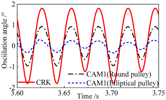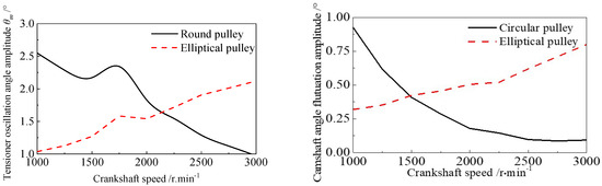 Figure 18 shows the tensioner oscillation angle and the fluctuation amplitude of the camshaft under the two schemes of the elliptical pulley and circular pulley. It can be seen from Figure 18a that the oscillation angle amplitude of the tensioner in the circular pulley scheme gradually decreases with a larger rotational speed. This is because the amplitude of the rotational vibration decreases as the rotational speed increases. For the elliptical pulley scheme, the tensioner oscillation angle increases with a larger rotational speed, but its changing trend is gentler. Meanwhile, at low rotational speeds, its amplitude is smaller than that of the circular pulley scheme. The overall average amplitude of the elliptical pulley scheme is smaller than that of the circular pulley scheme. Moreover, in the low-speed scenarios where the usage proportion is relatively large, the amplitude of the oscillation angle is smaller, indicating that the tension fluctuation is more stable. Similarly, the angle fluctuation trend of the driven pulley CAM1 shown in Figure 18b is also the same as that of the tensioning arm.