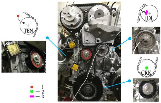 Test rig to evaluate the dynamic performances of the timing belt system. 1—laser displacement sensor; 2—angle encoder; 3—pressure sensor.
