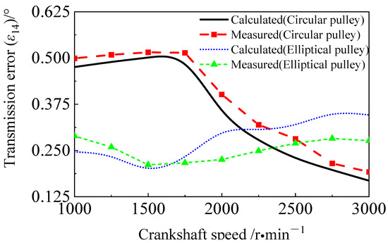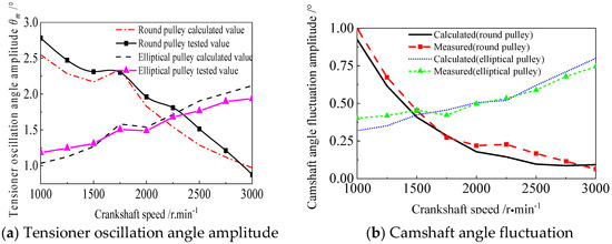 Figure 19 shows the transmission error between the driving pulley crankshaft (CRK) and the driven pulley camshaft 2 (CAM2). It can be seen that the amplitude of the transmission error of the circular pulley scheme shows a rapid decreasing trend if the crankshaft speed is larger than 1750 r·min−1. The average error of the circular pulley at all rotational speeds is 0.383° (measured value). For the elliptical pulley scheme, the transmission error changes are gentler than those of the circular pulley scheme. The transmission error shows an upward trend when the rotational speed is greater than 1500 r·min−1. The average error of the elliptical pulley at all rotational speeds is 0.253° (measured value).