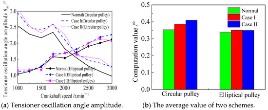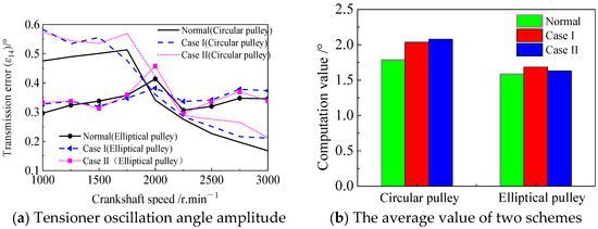 For the circular pulley scheme in Figure 20, when the performance declines, as in Case I and Case II, the oscillation angle amplitude of the tensioner increases by a value 0.4–0.5° compared with the initial performance. For the elliptical pulley scheme, the increases in the oscillation angle amplitude of the tensioner are all within 0.3°. Moreover, when the crankshaft excitation speed is below 1750 r·min−1, the amplitude of the tensioner oscillation angle does not vary much. Similarly, under the elliptical pulley scheme, the variation amplitude and average transmission error are smaller than those under the circular pulley scheme.