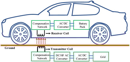 In contrast, AVPC coils exhibit strong sensitivity to capacitor positioning. When capacitors are properly aligned with the SIW phase pattern, destructive interference substantially reduces E-field emissions. However, misalignment disrupts phase cancellation and can degrade performance below that of conventional configurations. These findings demonstrate that while capacitor placement serves as a secondary tuning parameter in traditional systems, it becomes a critical design constraint in phase-inverted architectures. To the best of our knowledge, this study is the first to systematically introduce and experimentally validate the AVPC coil topology, explicitly leveraging sequential phase inversion combined with strategic capacitor alignment as active design parameters for suppressing electric field emissions. Unlike prior influential studies, such as Christ et al. [], which primarily focus on exposure assessment methodologies, safety standards, and biological dosimetry, our approach provides a structural, hardware-level solution validated through comprehensive full-wave FEM simulations and experimental measurements. This fills a critical research gap, significantly reducing peak E-field amplitudes and improving electromagnetic compatibility for practical high-power WPT applications. To clarify the system context, Figure 1 illustrates a typical wireless EV charging architecture based on inductive power transfer, where the proposed transmitter coil topologies and distributed compensation strategies are applied.