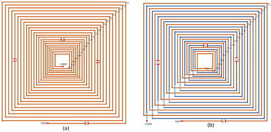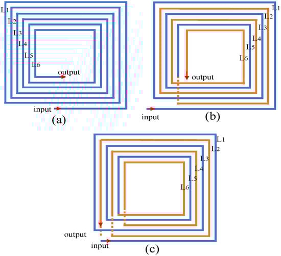 In the context of wireless electric vehicle charging applications, this section compares different coil topologies for the transmitter side of inductive power transfer systems. Traditional IPT coils, as depicted in Figure 2a, are characterized by sequential, uniform turn arrangements (L1→L2→L3→L4→L5→L6). While simple and widely adopted, this straightforward winding inherently results in identical phases along adjacent coil turns. Conversely, SIW, as shown in Figure 2b,c, employs a novel interleaved winding structure: current first traverses odd-numbered turns (L1→L3→L5), then reverses through even-numbered turns (L6→L4→L2) []. This unique configuration inherently produces alternating phase relationships between adjacent coil segments, fundamentally distinguishing SIW coils from traditional winding approaches. This innovative coil topology offers distinct structural advantages and is a promising advancement in wireless power transfer coil designs.