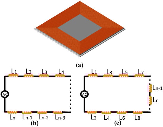 (a) Optimized coil design. (b) Equivalent circuit models of a traditional sequential coil. (c) Equivalent circuit models of sequential inversion winding coil.