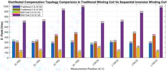 The electric field simulation results presented in Figure 9 were validated through detailed experimental measurements, as summarized in Figure 12. These experimental data illustrate measured E-field intensities across various spatial points for each coil configuration, allowing direct comparison with the corresponding FEM-predicted distributions. The SIW coils, particularly with capacitors placed at turns 1, 5, 10, and 15, consistently exhibited significantly lower E-field levels compared to traditional coil configurations. Specifically, the SIW coil with optimal capacitor placement maintained measured E-field strengths below 200 V/m across all test points. Conversely, the misaligned SIW coil configuration (turns 1, 6, 12, and 18) resulted in substantially higher measured fields, surpassing 1000 V/m at some spatial positions, consistent with simulation predictions. Traditional coil configurations displayed intermediate E-field strengths, with minimal dependence on capacitor placement. It is important to emphasize that the E-field measurements presented here were taken at a vertical height of 50 mm above the coil surface, representing a deliberately selected worst-case proximity for near-field characterization. These values reflect localized pointwise magnitudes and are not intended for direct comparison with ICNIRP biological exposure limits. Specifically, ICNIRP (2010) recommends internal electric field averaging over 2 × 2 × 2 mm3 tissue volumes to assess electrostimulation thresholds []. For external fields, spatial averaging procedures are left to the relevant standardization bodies. For formal compliance, standards like IEEE C95.1 [] require specific averaging protocols beyond our scope. As such, our pointwise values likely represent a conservative overestimate of actual exposure.