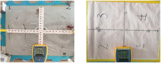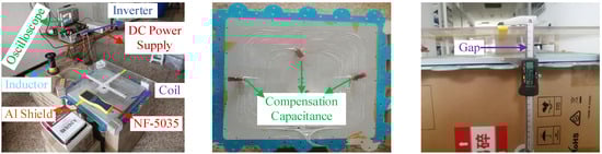 The measurement setup (Figure 10) utilized an LCC compensation network operating at 85 kHz, with passive elements (LP and Cp1-Cp4) configured and E-field measurements were obtained using an NF-5035 near-field electric field probe positioned 50mm above the coil surface. Spatial measurements were taken at four coordinates, (X, Y) = (0, ±150 mm), (±150 mm, 0). While exact sensor placement was subject to minor positioning deviations due to practical constraints, it corresponded to the FEM-predicted E-field (Section 4.3). Each configuration was tested over three independent trials to account for environmental variability, including ambient EMI and conductive surroundings. E-field values were averaged, with standard deviation occasionally exceeding ±10%, reflecting real-world influences on measurement fidelity. Prior to assembly, individual capacitor values were measured and confirmed to lie within a ±3% tolerance range. System resonance at 85 kHz was verified after placement, confirming proper compensation despite small component-level variations.