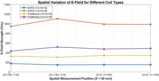 It is also worth addressing the small deviations observed across spatial measurement points in Figure 12, which ideally should be symmetric. While the coil geometries are symmetric in design, perfect experimental symmetry is difficult to maintain due to slight probe misalignments (±5 mm), environmental factors (e.g., nearby reflective surfaces, metallic structures), and manufacturing tolerances in winding and capacitor positioning. Notably, the AVPC (1-5-10-15) configuration showed the most uniform profile among all cases, indicating not only its E-field reduction capability but also enhanced spatial consistency. This consistency further strengthens its suitability for minimizing emissions in real-world applications. While suppression of E-field components may affect the local wave impedance, FEM simulations confirm that the H-field remains well-confined by the ferrite structure and does not exceed typical safety thresholds. This demonstrates that the AVPC topology offers dual benefits, effective reduction of capacitive emissions while maintaining stable magnetic field behavior within safe limits. It should also be noted that while this study focuses on electric field emission behavior, additional evaluation would be necessary in safety-critical environments, especially for users with implantable medical devices. Interference with such devices may occur at field levels below general ICNIRP thresholds, particularly in the low-frequency range around 85 kHz. Although not directly evaluated here, this is an important consideration for real-world deployment. Notably, the AVPC configuration (capacitors at turns 1, 5, 10, and 15) consistently maintained E-field levels below 220 V/m at all measurement points, reducing the potential for EMI with implantable medical devices even under close-range, unshielded conditions. While our work does not simulate specific implantable device models, these findings provide valuable preliminary guidance for emission-aware design, particularly in ensuring spatial E-field suppression near the coil surface.