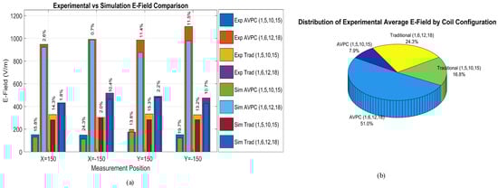 To complement Figure 13, it is important to emphasize that accurate E-field measurements in a laboratory environment are inherently subject to variations due to uncontrollable environmental factors. These include surrounding conductive materials, ambient EMI sources, and slight probe positioning discrepancies. In our setup, the NF-5035 probe was mounted on a non-conductive arm to eliminate hand/body interference, and the sensor height was referenced to the approximate center of the internal E-field sensing element, located just beneath the front screen of the probe body (not the outer casing), to improve spatial accuracy. As a result, pointwise agreement between experimental and simulated E-field values may not be exact. Although a separate calibration in a uniform reference field was not performed, the use of consistent positioning and repeatable environmental conditions across all coil configurations supports the relative accuracy of the data.