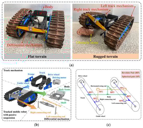 Tracked mobile robot with passive suspension: (a) robot prototype; (b) robot structure; (c) schematic diagram of passive suspension structure.