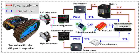 The communication circuit of the tracked mobile robot prototype is shown in Figure 2. The 24 V DC battery supplies power to the left drive motor, the right drive motor and the industrial personal computer. In addition, a power sensor is used to detect the real-time circuit and voltage of the drive motor. The industrial personal computer sends control commands to the pulse output module through the Usb-CAN module to control the forward and steering of the tracked mobile robot. The pulse output module sends the PWM signal to the motor drive module to control the rotation direction and speed of the drive motor. At the same time, according to the actual engineering requirements, various external sensors such as inertial measurement units, vibration sensors, etc. can be installed, and the collected data can be sent to the industrial personal computer for recording and analysis in real time through the line.