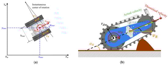 Due to the use of passive suspension, the tracked mobile robot will have a certain angle between the track mechanism on both sides and the horizontal ground when driving in rough terrain. Figure 3b is the diagram on the right side. is the track–ground contact angle of the right track mechanism. Considering the contact angle and slip between the track and the ground, the relationship between the track plane velocity and the angular velocity of the left drive motor and the angular velocity of the right drive motor is