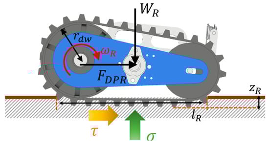 When the tracked mobile robot travels on soft ground, the normal stress and tangential stress will be generated between the track and the ground, as shown in Figure 5. According to the theory of terramechanics [25,26], stress can be expressed as