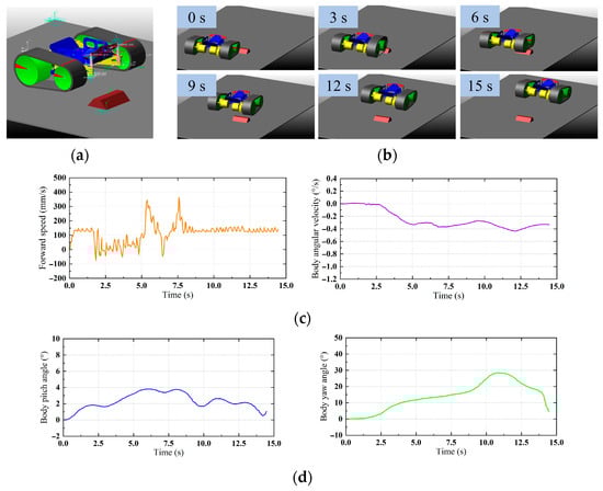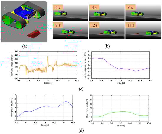 Simulation of tracked mobile robot with passive suspension: (a) simulation settings; (b) moving process; (c) vehicle motion state; (d) body posture.