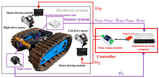 On the basis of the hardware conditions of the tracked mobile robot and the sensing information required for control, the control signal transmission line of the tracked mobile robot is built, as shown in Figure 8. In order to obtain the real-time driving state of the robot system, an inertial measurement unit is installed at the geometric center of the vehicle body. The inertial measurement unit is used to collect the forward speed and body rotation angular velocity of the tracked mobile robot in real time. At the same time, the posture of the robot body is collected, including pitch angle , roll angle and yaw angle . In order to analyze and calculate the attitude state and change of the passive suspension of the robot, according to Equation (13), an angle sensor needs to be installed on the horizontal swing rod of the differential mechanism to collect the angle of the horizontal swing rod in real time.