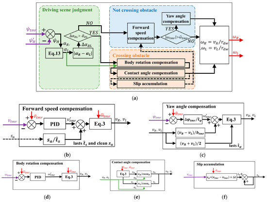 Track speed control algorithm schematic diagram: (a) overall principle flow chart; (b) forward speed control; (c) yaw angle control; (d) contact angle control; (e) body rotation control; (f) slip accumulation.