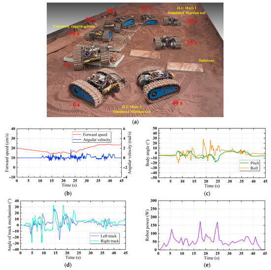Figure 10 shows the conventional moving test results of a tracked mobile robot prototype with passive suspension. Figure 10a is the test scenario and test process. The prototype of the tracked mobile robot is first driven on JLU Mars 3 simulated Martian soil, which is extremely rugged terrain. The robot successfully crossed the extremely rugged terrain and climbed down from the edge of the terrain to JLU Mars 1 simulated Martian soil. The robot continued to move forward through the slate obstacle to return to the initial position. It can be seen that the tracked mobile robot with passive suspension can maintain a good driving state and vehicle subsidence in flat and soft terrain, and there will be no significant rotation or subsidence trapped. The driving performance of tracked mobile robots using passive suspensions on rugged rocks is very beneficial. During the driving process, the suspension mechanism on both sides can maintain good contact with the ground according to the terrain fluctuation and avoid the phenomenon of the track mechanism vacating. The track mechanism can maintain a good angle relationship with the body. When the robot climbs up the rugged terrain, the effect of the passive suspension is very significant, as shown in Figure 10a when the driving time is 5 s. The tracked mobile robot has a certain angle with the edge of the terrain, so that the right tracked mobile mechanism first contacts and climbs. Due to the use of passive suspension, the right crawler moving mechanism can be lifted and climbed first. This avoids the phenomenon of driving obstruction or climbing failure caused by the angle between the crawler mechanism on both sides and the edge of the terrain.