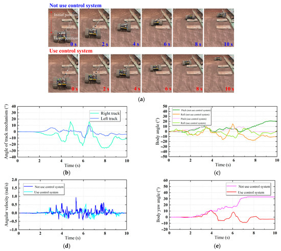 Control system test of tracked mobile robot: (a) test process; (b) track mechanism angle (not using control system); (c) body posture; (d) body rotation angular velocity; (e) heading deflection.