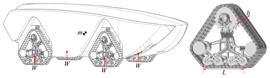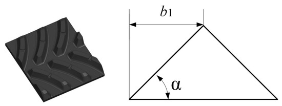 Grouser geometries are primarily categorized into three types: straight-line, V-shaped, and W-shaped. The straight-line grouser fails to form enclosed spaces during operation, resulting in limited efficacy in enhancing soil compaction and drawbar pull, alongside inferior lateral slip resistance. In contrast, V-shaped and W-shaped grousers generate enclosed soil-trapping zones through their geometric profiles, thereby enhancing soil compaction and drawbar pull via compressive and shear interactions. In this study, the vehicle employs a narrow-track configuration. Given dimensional constraints that preclude the application of W-shaped grousers, the V-shaped design is selected. As illustrated in Figure 3, the left panel depicts the actual grouser morphology, while the right panel shows its theoretical simplified model, where denotes the oblique rib width and represents the V-shaped angle.