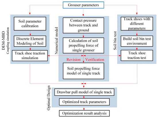 To address the three aforementioned research gaps, this study focuses on optimizing the structural parameters of tracks and grousers for UATV. A numerical model for predicting soil thrust is established for track shoes based on terramechanics theory. DEM-MBD coupling simulations are employed to investigate the effects of track and grouser structural parameters on soil thrust, and to concurrently validate the numerical model. The accuracy of the numerical model and the efficacy of the coupling simulation methodology are further verified through a soil bin test on track shoes, yielding a validated mathematical optimization framework. Finally, single-track drawbar pull is selected as the optimization objective to iteratively refine structural parameters. The research methodology is systematically outlined in Figure 2.